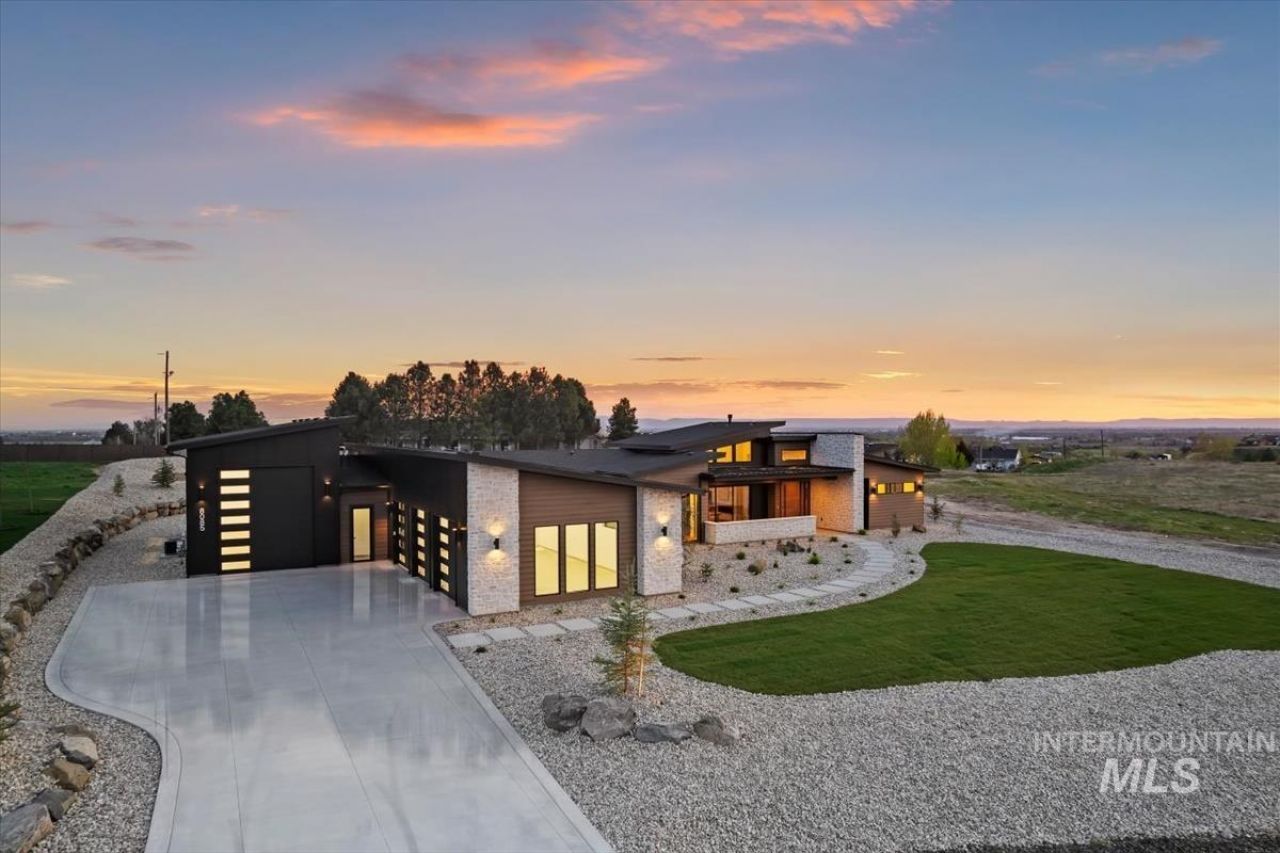 Experience the pinnacle of sophisticated high-desert living in this stunning custom mountain modern masterpiece by Artisan Builds. Located in Wyatts Hollow, Middletons premier acreage view subdivision, this residence is perched perfectly in the foothills to capture breathtaking valley-wide panoramas. The architecture is a masterclass in the mountain modern aesthetic, defined by a seamless blend of natural materials & clean lines that harmonize with the rugged landscape. Inside, the expansive open floor plan is bathed in light from soaring windows & vaulted ceilings, creating an airy & luxurious atmosphere. The heart of the home features a sleek plastered fireplace in the great room mirrored by a second fireplace in the master suite. Designed for the ultimate entertainer, the layout offers a fluid transition between indoor & outdoor spaces including a charming front terrace off the dining area, three distinct back patio retreats & a fire pit area in the backyard. The functional brilliance of the home continues with three guest en-suites ensuring privacy for all & a master retreat boasting his & hers closets plus a private patio. On over an acre, this property provides an oasis of tranquility & utility with a 3-car garage plus a massive 50ft deep RV bay w/ 14ft tall door. With meticulous finish selections curated for the most discerning buyer, this home is truly one-of-a-kind!!